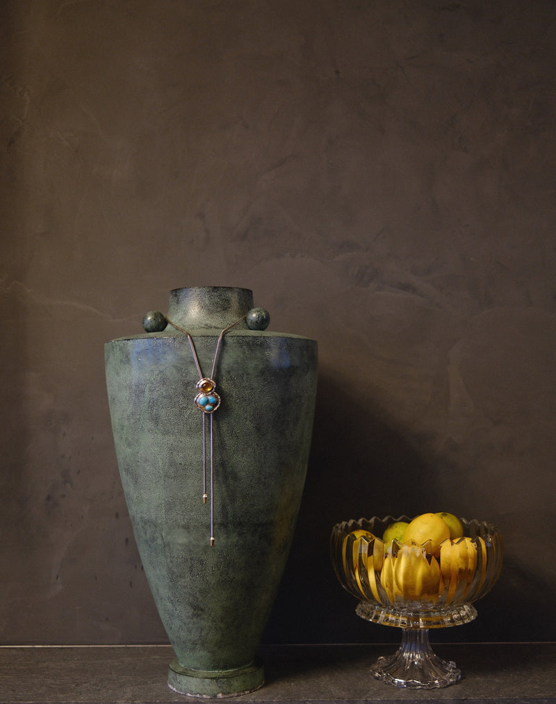 A proprietary sliding mechanism allows the piece to move effortlessly between a classic bolo tie and a loosely worn statement necklace.